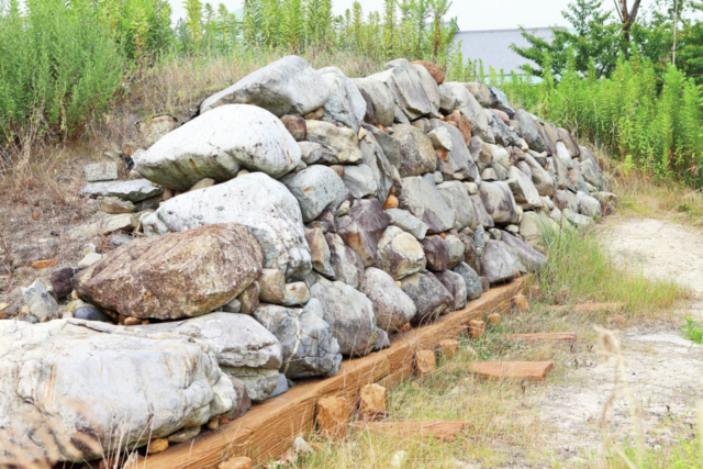 城址横で発掘された石垣を「五条川堤防遊歩道」内に再現