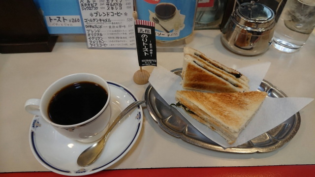 コーヒーと一緒にぜひ試していただきたいのは、「のりトースト」。パンに醤油をたらし、焼海苔を挟んで焼いた後、バターを塗りパンの耳をカットした、素朴な材料で作られたトーストは、毎日食べても飽きないほどのおいしさです!
