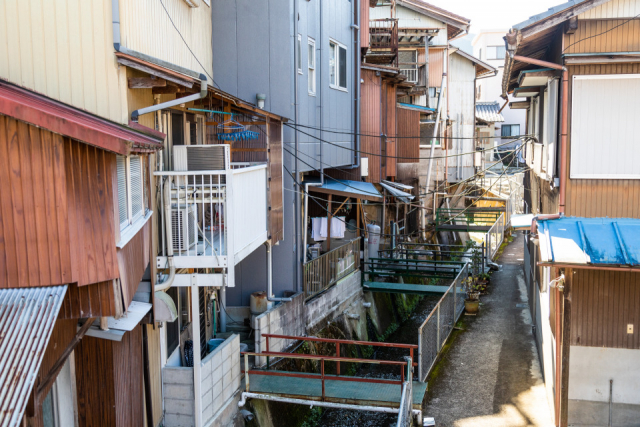 江戸時代に生まれた筋骨は、その後も昭和40年代まで独自に発展。幅1mにも満たない通りや急に開けた空間、水場などがあり、ワクワクドキドキの探検気分を味わえます。細い路地を覆うように増改築を繰り返した建物群は、レトロ感と非日常感がたっぷりですよ。