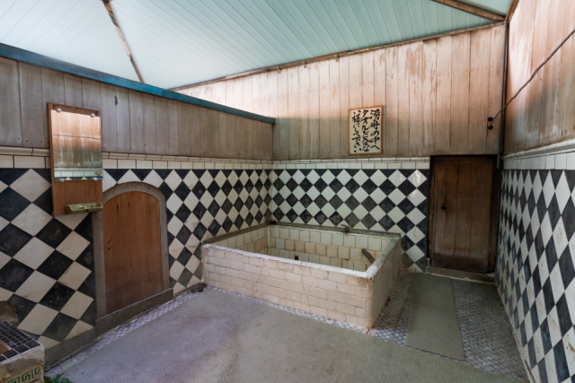 1988(昭和63)年まで営業していた銭湯、旭湯。廃業から30年以上経った現在も建物は残り、男湯を自由に見学することができます。木製ロッカーの脱衣所やタイル貼りの風呂のほか、カレンダーや扇風機などすべてが当時のまま!