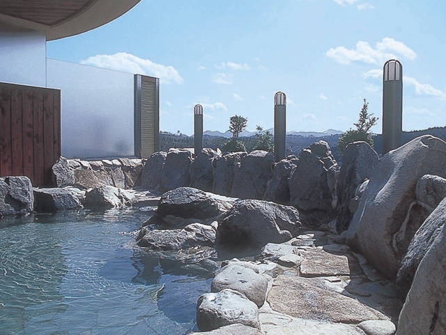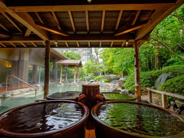 庭園露天風呂、岩風呂、展望浴場、大浴場、家族風呂があり、風呂めぐりが楽しめる。庭園露天風呂は庭の中に浴槽を配した開放的な空間。駐車場にバス停を兼ねた足湯もある。