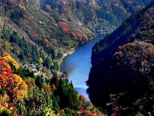 宮崎県との県境にそびえる向坂山の北麓に位置する峡谷。川の流れは穏やかで美しく、釣りや川遊び、キャンプなどで自然と親しめる。寒暖の差が大きいために、黄や赤が色濃く鮮やかに紅葉し山々を飾る。