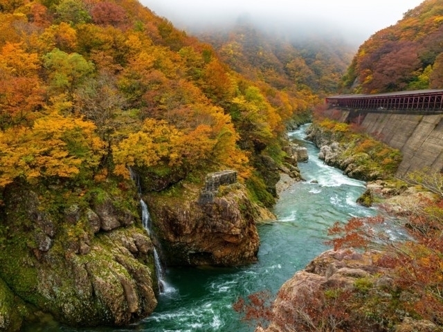 迫力ある断崖絶壁の峡谷を色とりどりに染める紅葉