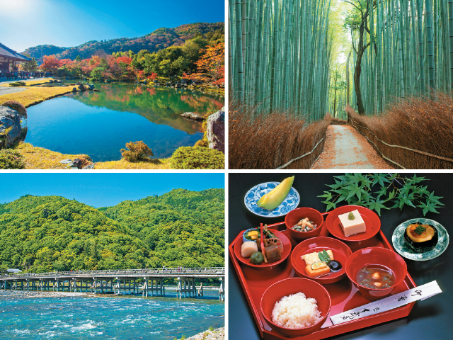 「渡月橋」では京都屈指の自然美を満喫できます。人力車に乗って四季折々の情景を楽しみましょう。国の史跡・特別名勝に選ばれた名庭を持つ「天龍寺」で、嵐山を借景にしたダイナミックな庭園と雲龍図を拝観するのもおすすめ。