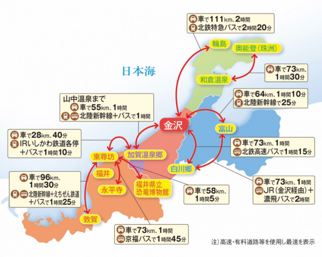 - 福井エリア:小松空港から車で1時間10分/JRで1時間20分(小松駅経由)