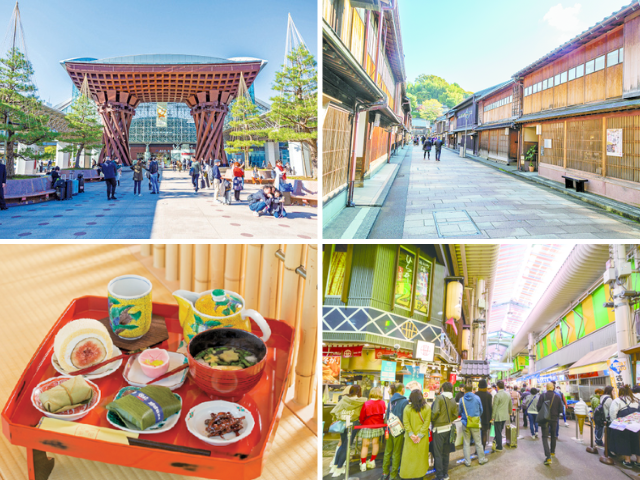 1日目はJR金沢駅からスタート!まずは兼六園や金沢城公園を散策しましょう。お昼は近江町市場で海の幸ランチに舌鼓。