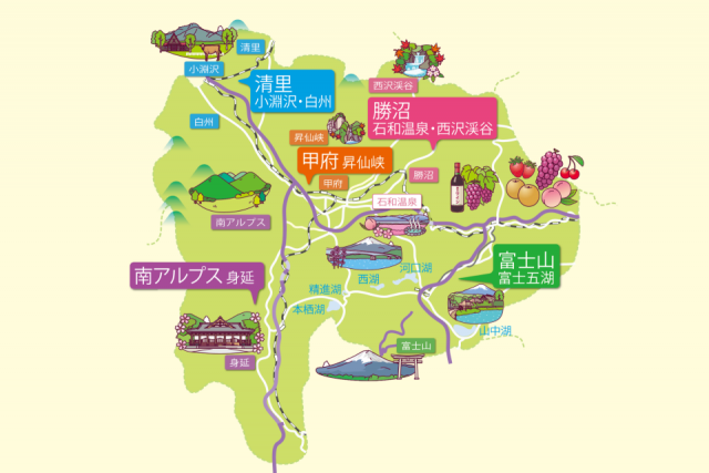 ここからは、山梨の5つのエリアごとに、初めての旅行にぴったりなおすすめスポットをピックアップしてご紹介していきます!