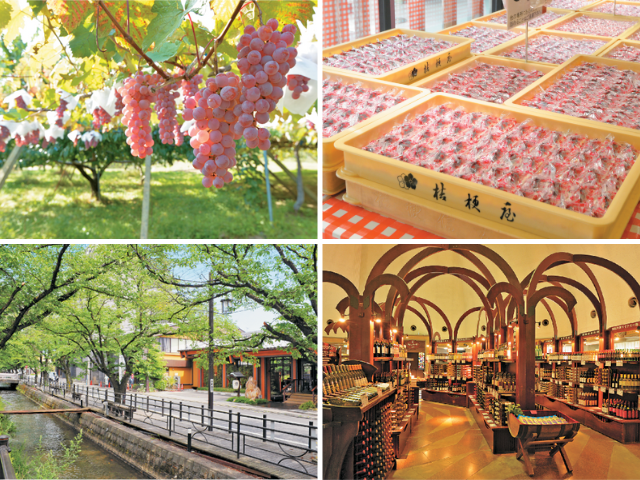 代表的スポット:ワイナリー群、笛吹桃源郷、桔梗信玄餅工場テーマパーク、石和温泉郷、大善寺など