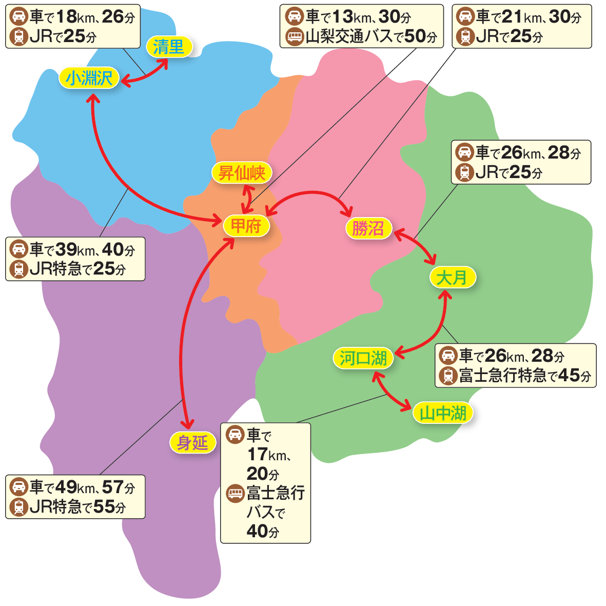 続いて、山梨県の主要観光エリアへのアクセスと、各エリア間の移動にかかる所要時間をご紹介します。