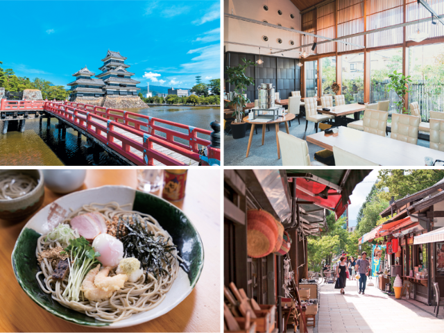 宿からシャトルバスで30分、車を約1時間走らせたら国宝 松本城に到着です。天守からの絶景を楽しんだら、城下町の中町通りを散策。歩き疲れたら、市街にあるレトロ喫茶でひと息入れるのもおすすめ。その後、松本市美術館で、世界的アーティストの作品に触れたり、おみやげグッズを探したあとは、帰り道の松本ICへと向かいましょう。