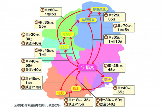 続いて、栃木県の主要観光エリアへのアクセスと、各エリア間の移動にかかる所要時間をご紹介します。