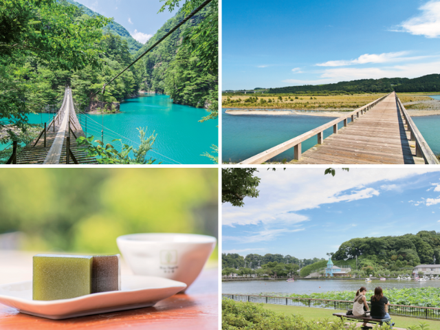 代表的スポット:大井川鐵道、夢のつり橋、蓮華寺池公園、蓬莱橋、寸又峡温泉など