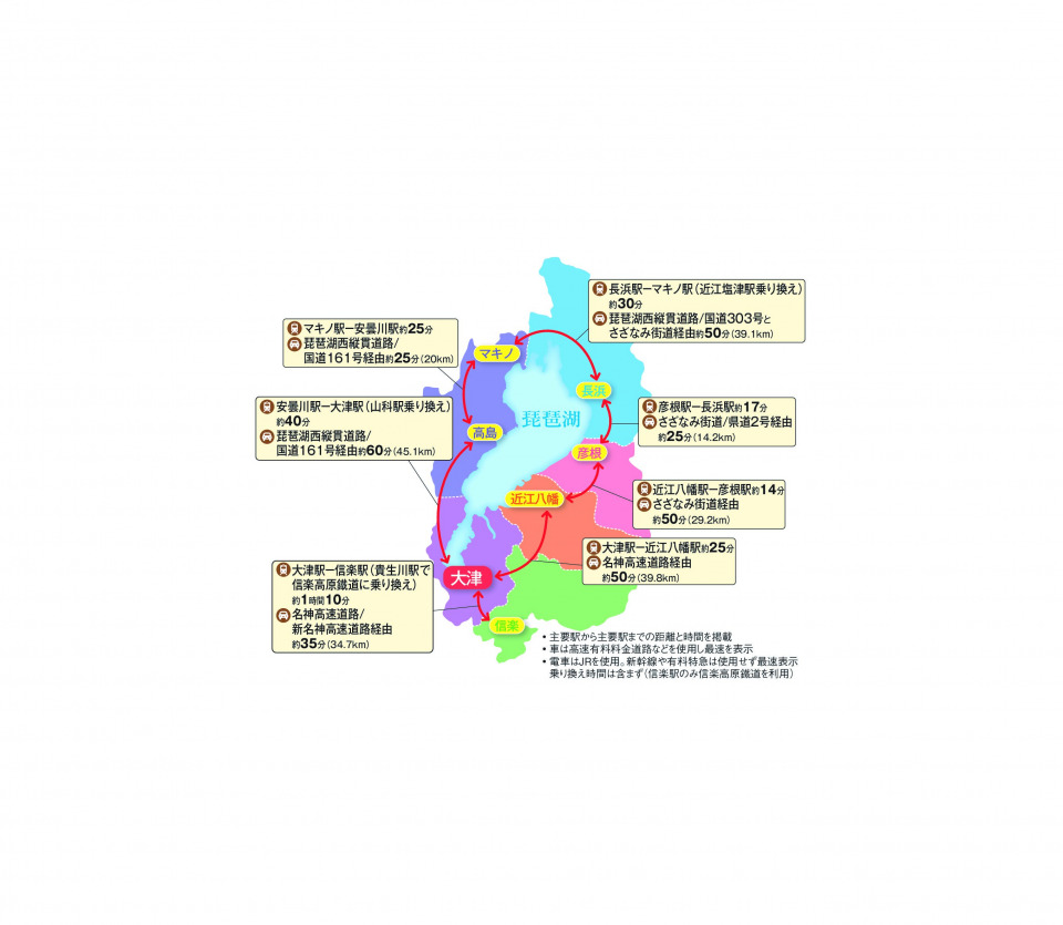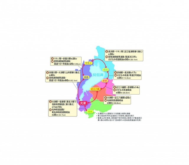 続いて、滋賀県の主要観光エリアへのアクセスと、各エリア間の移動にかかる所要時間をご紹介します。