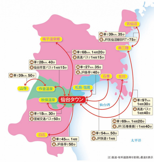続いて、宮城県の主要観光エリアへのアクセスと、各エリア間の移動にかかる所要時間をご紹介します。
