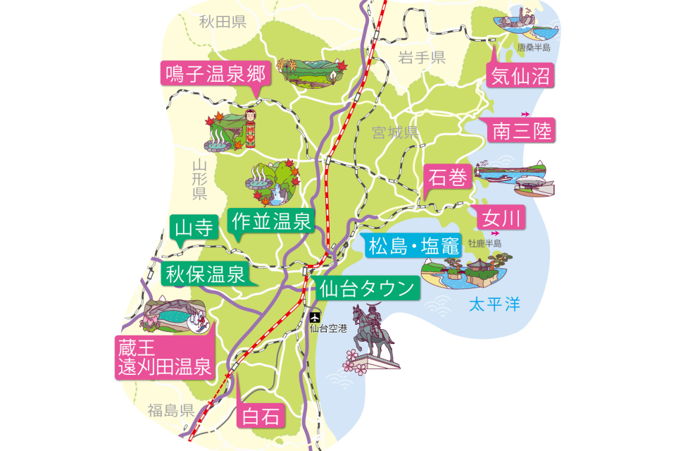 ここからは、宮城の6つのエリアごとに、初めての旅行にぴったりなおすすめスポットをピックアップしてご紹介していきます!