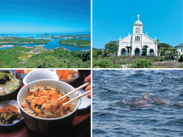 代表的スポット:天草五橋、崎津教会、イルカウォッチング、サンセットライン、天草下田温泉など