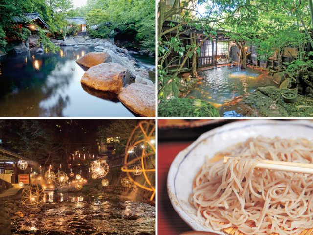 - 黒川温泉・小国郷(阿蘇駅):阿蘇くまもと空港から車で1時間30分/東京から飛行機で阿蘇くまもと空港約1時間50分+車で1時間30分