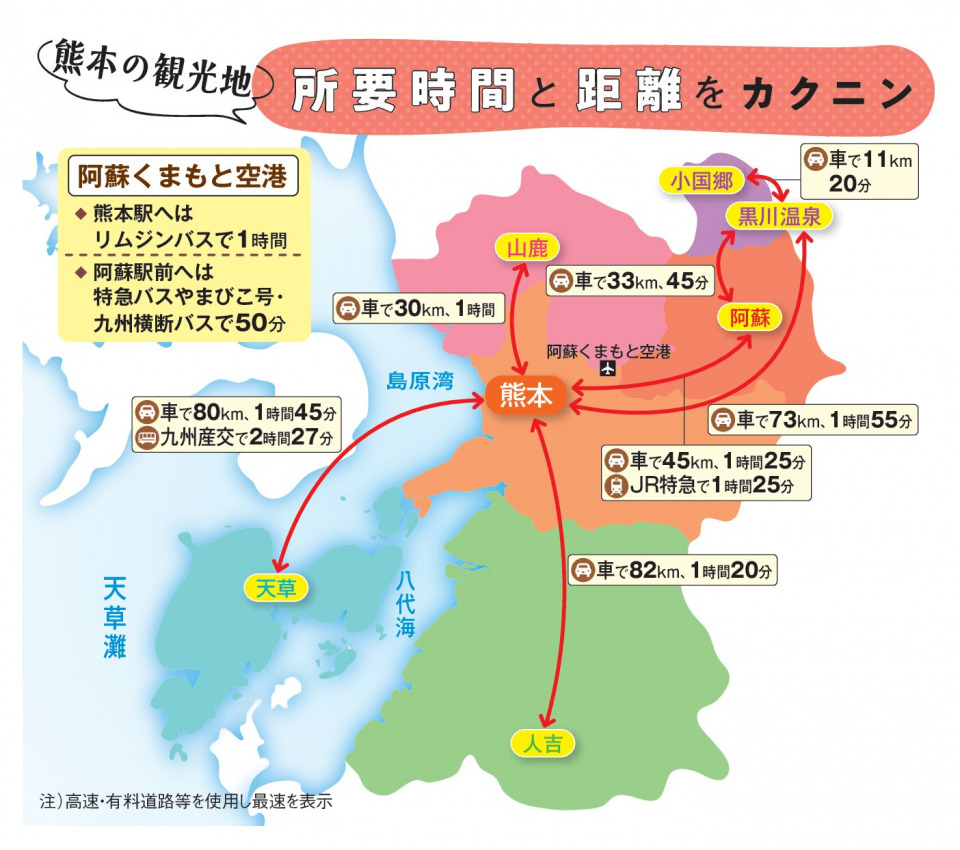 続いて、熊本県の主要観光エリアへのアクセスと、各エリア間の移動にかかる所要時間をご紹介します。