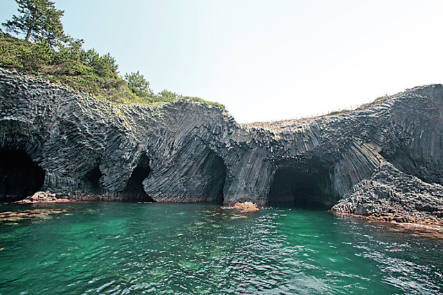 長い年月にわたって玄界灘の荒波を受け、玄武岩の断崖にできた景勝地。かまどを並べたような7つの洞窟は、間口およそ3m、奥行きおよそ110m。間近で見ると圧巻。