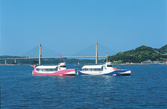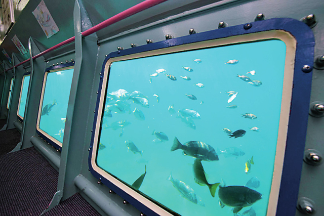 クジラの形をした半潜水型の海中展望船「ジーラ」で呼子の海を探検。船内は展望室になっていて、海面下の魚や海の生物を見ることができる。所要は40分。