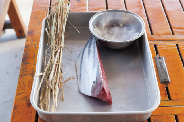 ①初級コースは節になったカツオを藁焼きするところからスタート