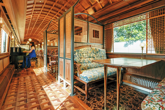 6号車 食事の際にはレストラン席に移動し、バイオリンとピアノの生演奏やコース料理を楽しめる