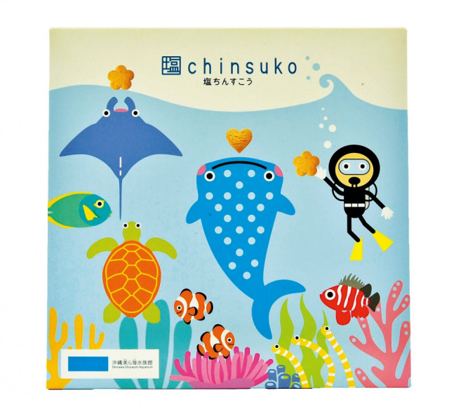 キュートな沖縄美ら海水族館限定デザインパッケージ。沖縄産の“青い海焼塩”を使用したハート形と花形のちんすこう