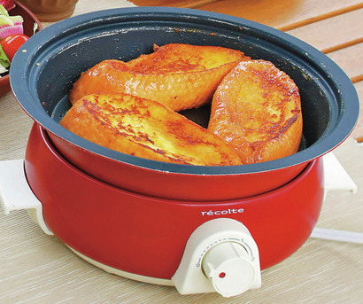朝食の主役は、香ばしく焼けたフレンチトースト。彩り鮮やかなサラダや卵、ソーセージを、ホットプレートで調理して。夕食に付いてくる東京ラスクフランスパンはひとり1本。朝食にもいただけます。