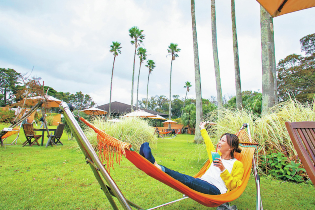 ヤシの木が生えた【アジアンガーデンR-Asia】では、島の風に吹かれながらのんびりと。