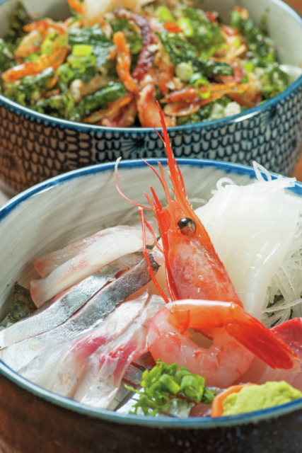 【磯料理みやした】の鮮度抜群の海鮮。「三鮮丼」(手前)、「のり丼」(上)