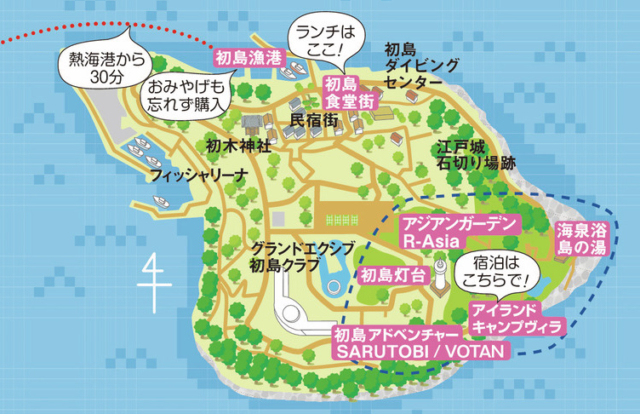 - 熱海港から富士急マリンリゾート高速船初島行きで30分、終点下船
