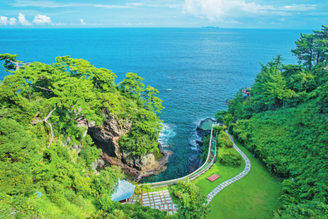 昇る朝日がこの浦の青い海や洞窟にそそぐと、美しい5色の光となって輝くことから名付けられた。開放的な海と、高さ80mにもなる迫力ある断崖の織り成す絶景は必見。【熱海】