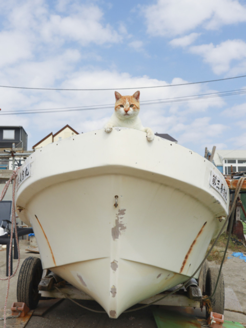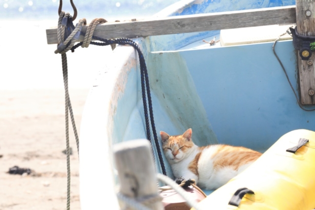 お昼どき、材木座にとどまるボートでお休みしていたのが漁師さんに飼われているキイロくん。