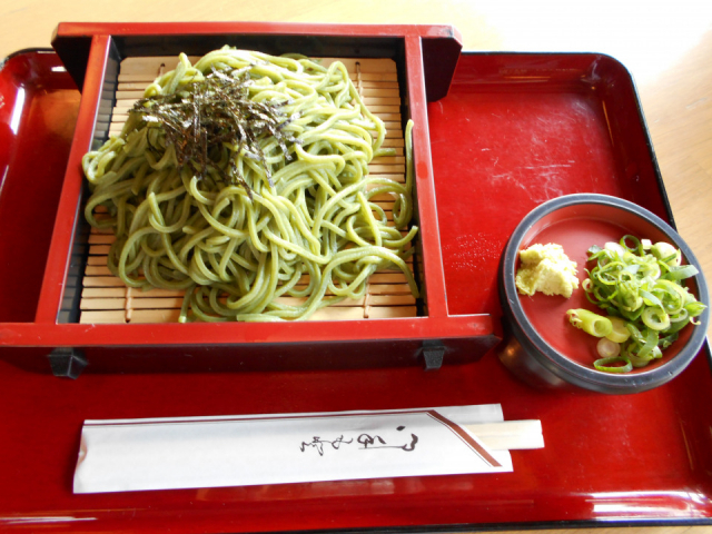 松崎町特産の桜葉を練り込んだ香り高い蕎麦