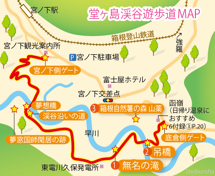 宮ノ下温泉街の北側を流れる早川沿いに整備された約1.5kmの散策路。清流と自然林が織り成す自然美が広がっている。スリリングな吊橋も必見。