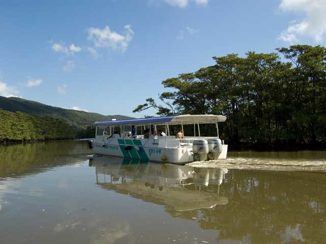 船長のガイドを聞きながら日本最大のマングローブをめぐる。潮の干満によりコースが異なり、満潮時のみ「森の巨人たち百選」のサキシマスオウノキを上陸して見られる。