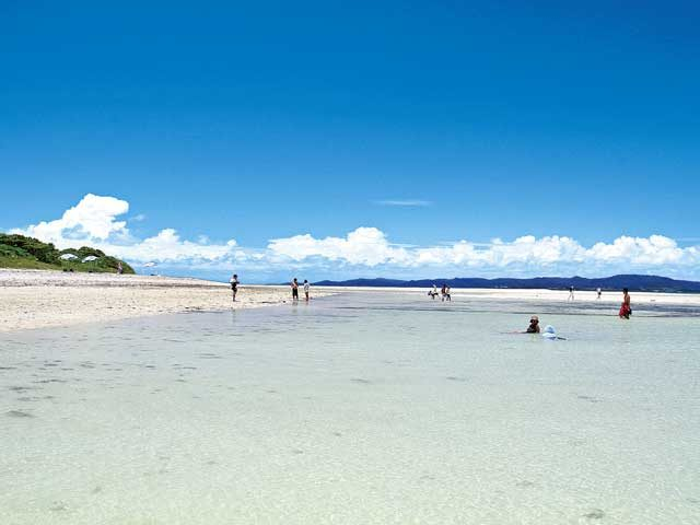 白い砂浜にクリスタルブルーの海は八重山屈指の美しいビーチとして人気が高い。コーラルサンドの砂浜を散策したり、干潮時に沖の砂地まで歩いて、美しすぎる海を堪能しよう。