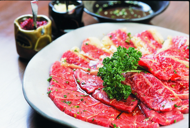 石垣牛 炭火焼肉 やまもとで石垣牛の焼き肉ディナー。脂身が多すぎず、甘みがあり、豊かな風味ととろけるような食感がポイント。
