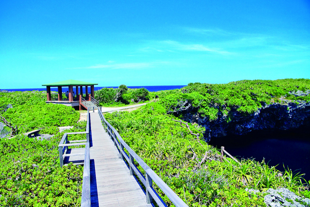 国の名勝で、宮古島随一の絶景スポット。数多くの植物が群生する約2㎞も続く岬の先端にある灯台からは大海原が一望できる。朝日スポットとしても有名。
