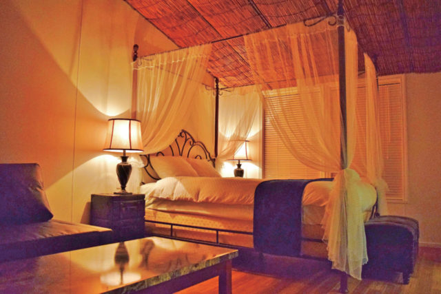 天蓋付きベッドがあるリビング。鳥の声と陽の光で目を覚ますのも素敵