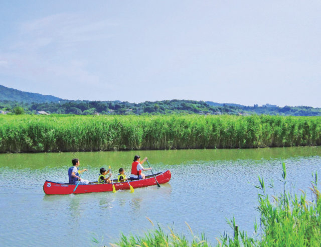 カヌーに挑戦。草が茂る迷路のコースを進む探検アクティビティは1艇2000円(1時間)。グランピングは専用カヌー付なので自由に水上さんぽを満喫できる。