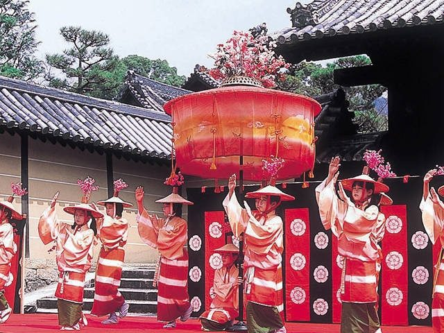 「はねず色」は梅の薄紅色のこと。梅花をあしらった菅笠姿の少女達が境内で踊る