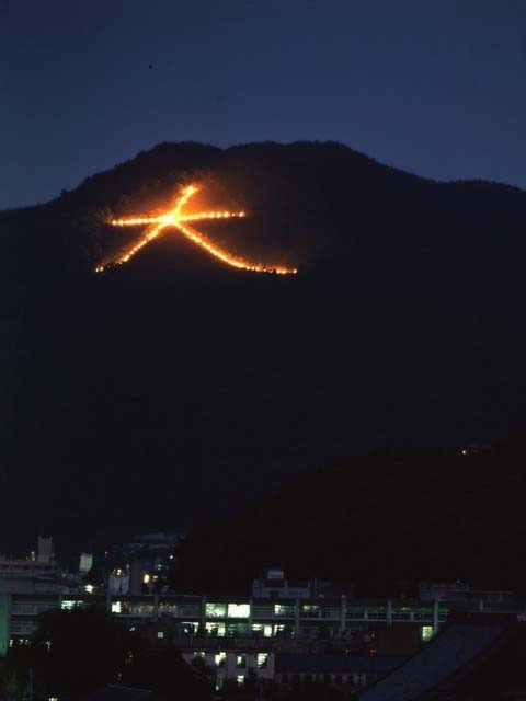 5つの山に火を灯して夜空を照らし、お盆に迎えたご先祖様の霊をあの世へと見送る
