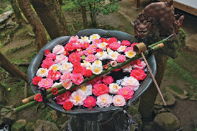 哲学の道近くの法然院は椿の名所。枝を離れた花も手水鉢に