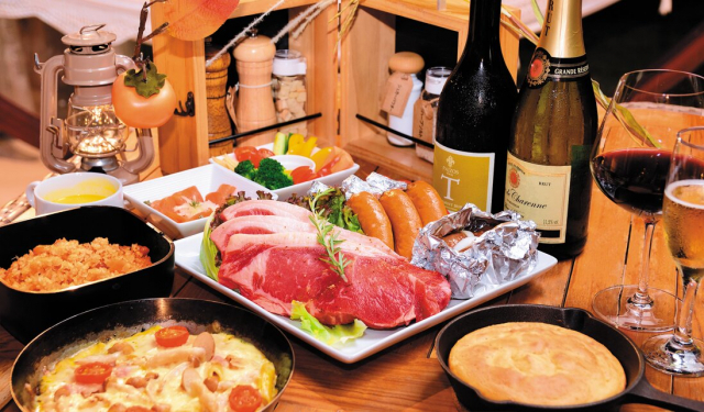 自分での用意をすべて省ける便利な2食付きプランなら、夕食は黒毛和牛ステーキを筆頭に、活きアワビや宮津産地魚のアクアパッツアといった豪華メニューがずらり。秋から冬にかけては薪ストーブで和牛シュラスコやブリの藁焼きなどを作るスペシャルな薪グランピング料理もおすすめです。