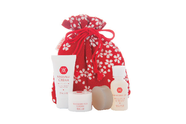 - リカバリィジェルクリーム=6380円(60g)/マッサージクリーム=7480円/桜ポーチ付き旅行セット=1980円/お試しセット=1980円(ポーチ入)/