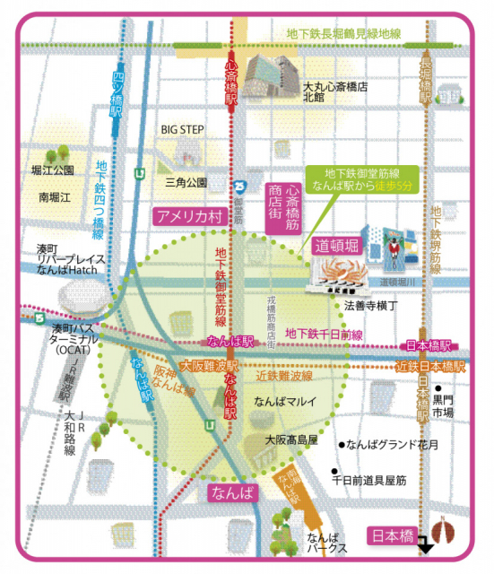 道頓堀・ミナミ旅行に出かける前に、各エリアの位置関係を把握して楽しい旅のプランを立てましょう!