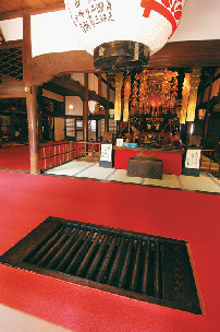 本堂正面入り口の埋め込み式の賽銭箱が落とし穴になるからくり。敵が攻めてきた際、簡単に細工することで落とし穴に早変わり。