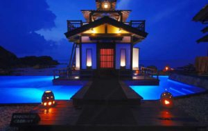ライトアップされると、珪藻土でできた白い島が真っ暗な闇に浮かびあがる。浜辺にある縁結びの鐘からの眺めはロマンチックで、デートスポットとしても人気。