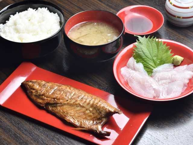 朝市で買った魚介や干物を持ち込むと、100円~の料金で刺身や焼き物などにしてくれる。海鮮丼や定食、一品ものも充実。